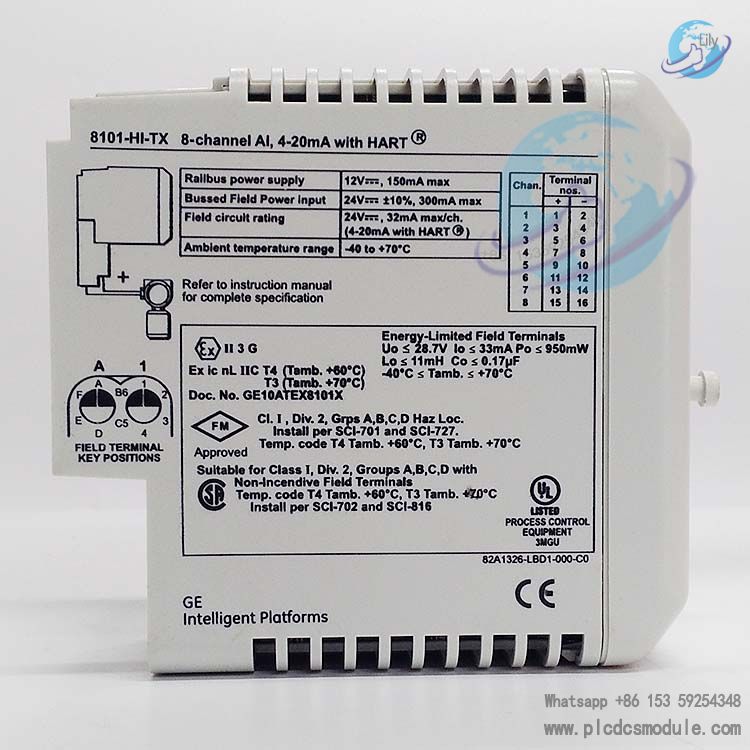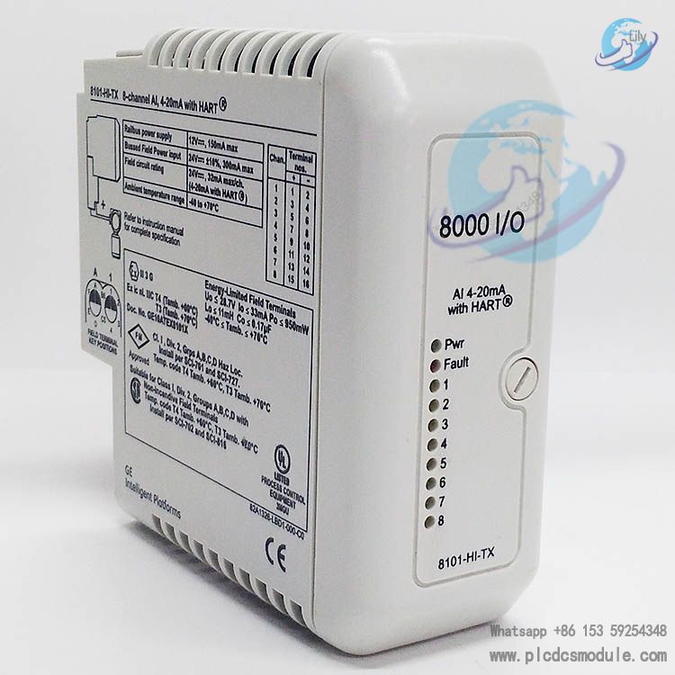 The GE 8101-HI-TX is a core 8-channel analog input module belonging to the PAC8000 modular I/O product line. Engineered specifically for industrial automation and process control applications, it is compatible with both 2-wire and 4-wire transmitters, and is equipped with HART protocol pass-through and variable status reporting functions. Meanwhile, it integrates non-incendive field circuits and line fault detection mechanisms. Capable of stably acquiring 4-20mA analog signals in industrial settings such as oil and gas, chemical processing, and power generation, this module delivers high-precision and highly reliable data input support to the system, and serves as a critical component for realizing automation and intelligent operation of production processes.