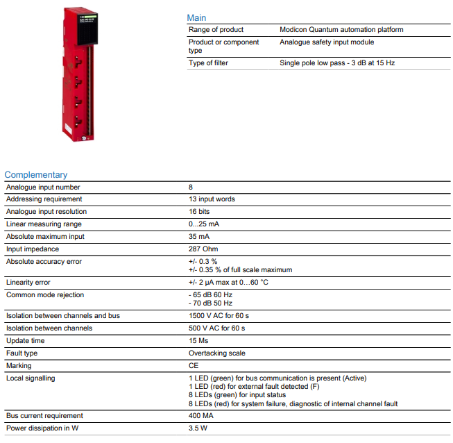 Product Affiliation: Modicon Quantum Automation PlatformNumber of Input Channels: 8 channelsAddress Occupancy: 13 input wordsInput Signal Type: 0~25mA current signal, with an absolute maximum input of 35mAResolution: 16-bitFilter Type: Single-pole low-pass filter with a 3dB cutoff frequency of 15Hz