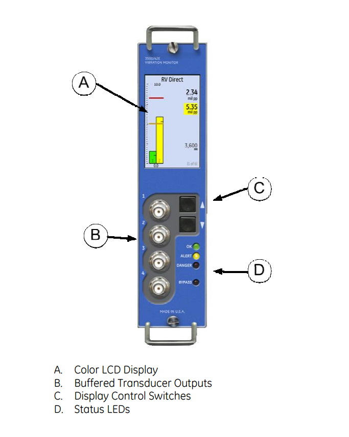 The 3500/42E Vibration Monitor is a 4-channel monitor that accepts input from
